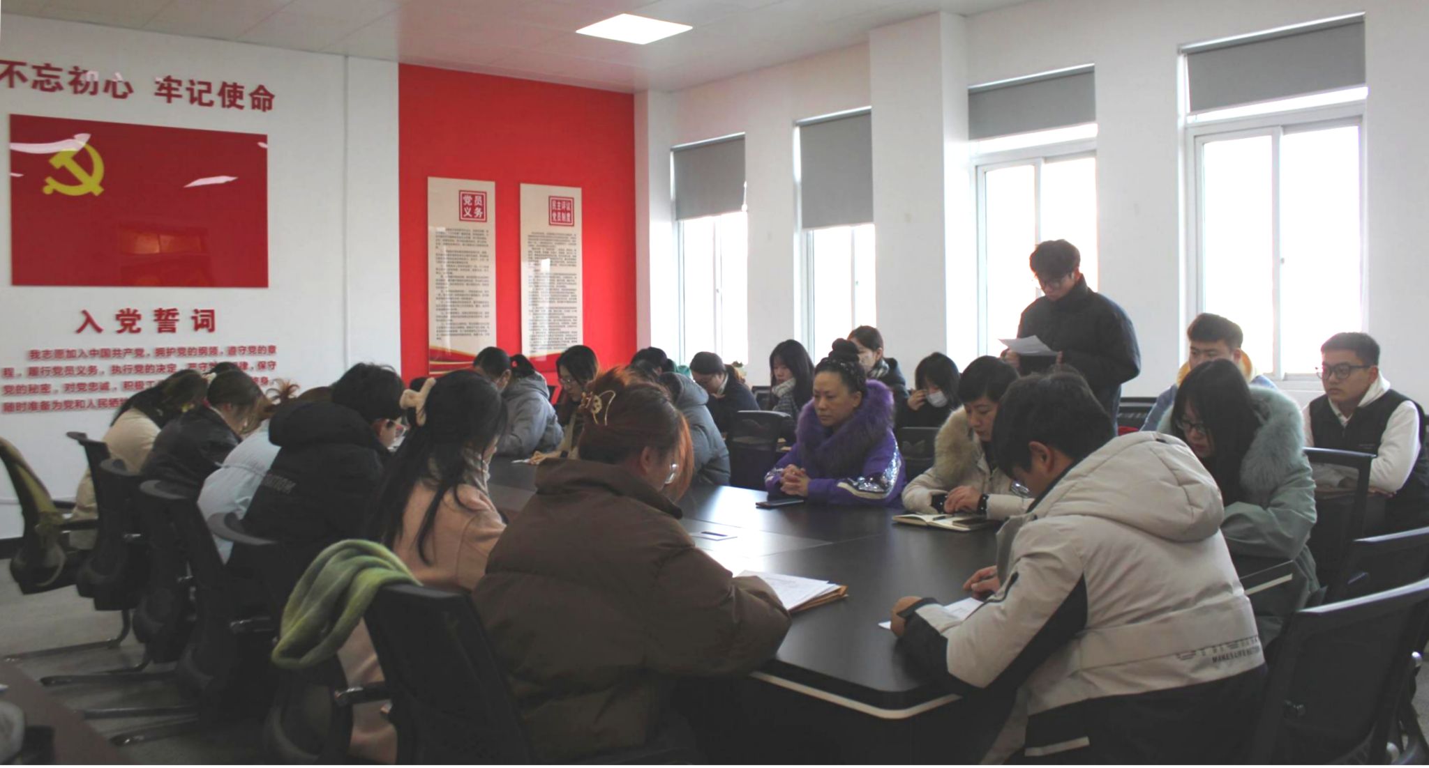 刘娟对新加入的预备党员表示祝贺,同时提出几点要求:一是进一步提高思想认识水平,做到思想上真正入党;二是加强学习能力,提高政治素养;三是正视自身的缺点和不足,并加以改进。在刘娟的带领下9名预备党员面向党旗进行入党宣誓。