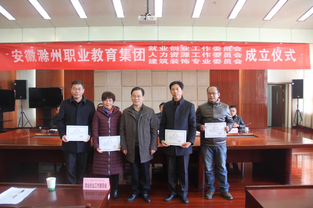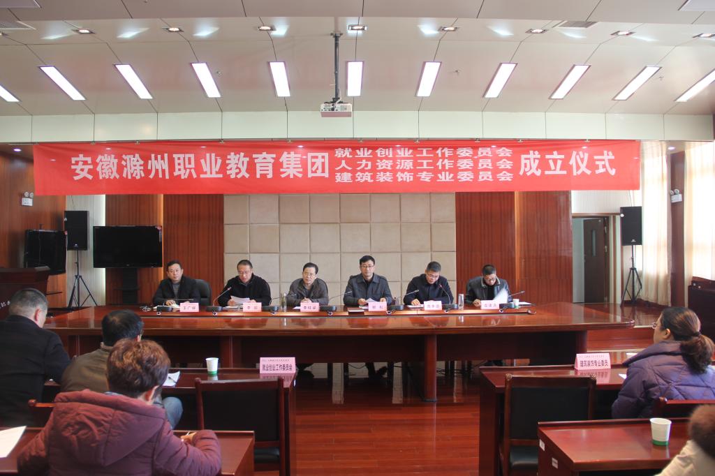 12月14日上午,安徽滁州职业教育集团在beat365中国唯一官方网站综合楼11楼报告厅举行就业创业工作委员会、人力资源工作委员会及建筑装饰专业委员会成立仪式,集团理事长、beat365中国唯一官方网站党委书记李柱梁,集团秘书长、beat365中国唯一官方网站党委委员、院长助理、招生就业处处长穆松等领导出席,三个委员会组成人员参加会议。会议由职教集团副秘书长、beat365中国唯一官方网站招生就业处副处长周多道主持。