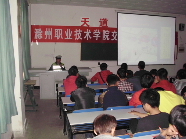 为了教育我院学生养成文明交通习惯,增强交通安全意识,提高自我保护能力。2013年10月23日保卫处邀请了滁州市交警支队二大队郑涛指导员来院做交通安全教育讲座,汽车系150余名学生参加了讲座。