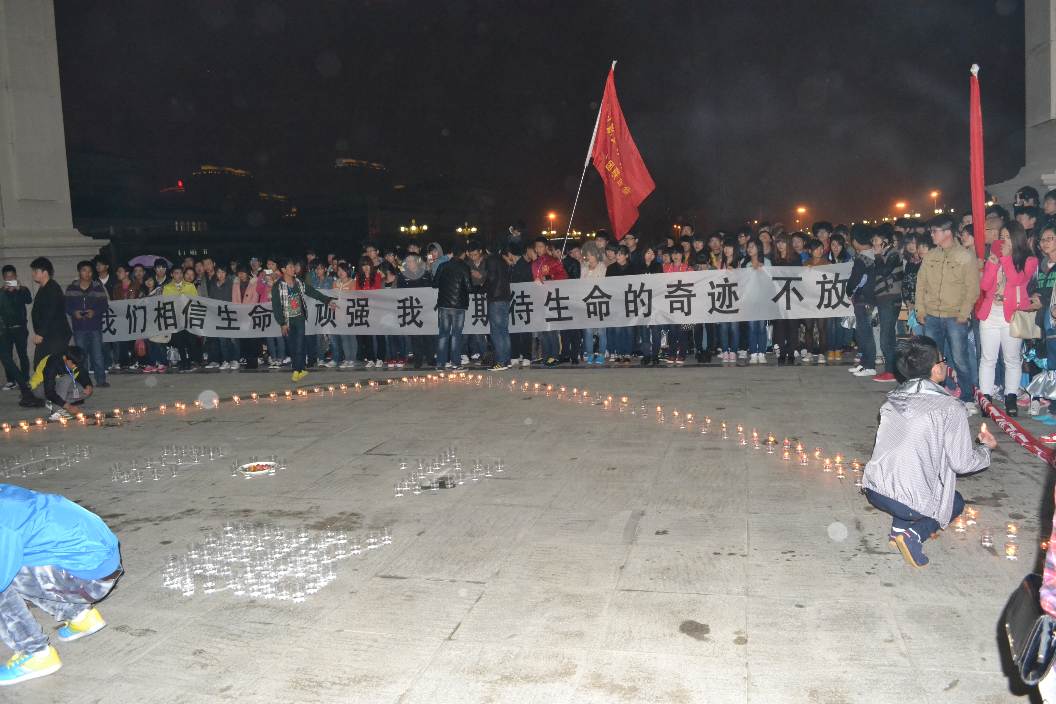 活动现场,有来自各系部的近四百名同学,大家用蜡烛,摆出爱心、“4.20”、“雅安”字样,由主持人发起为在雅安7级地震中遇难的同胞们默哀一分钟,并在祈福条幅上签下了自己对遇难同胞们的祝福、对灾区人民的祝福,现场同学们高呼“雅安加油、中国加油”,同学们声音洪亮,振奋人心。
