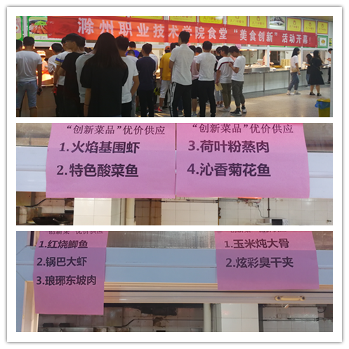 一楼安徽万友禾禾餐饮管理有限公司精心编制菜单,合理营养搭配,制作了“酸汤猪蹄”“蜜汁酱牛肉”等创新菜品。二楼安徽徽王餐饮管理集团有限公司总厨充分考虑南北方的口味差距及饮食习惯,推出了“东安仔鸡”等创新菜品,三楼安徽省天门湖餐饮管理服务有限公司经理刘兴平亲自上阵,坚持以大众化原料为基础,制作出了沁香菊花鱼、琅琊东坡肉、火焰基围虾等创新菜品。活动历时一个月,共推出20余种色、香、味俱全新菜品,新品推出后深受广大教职工认可和喜爱。