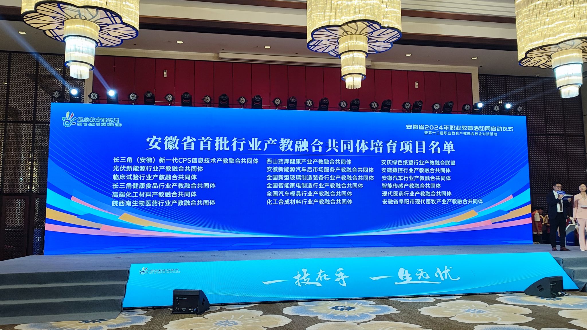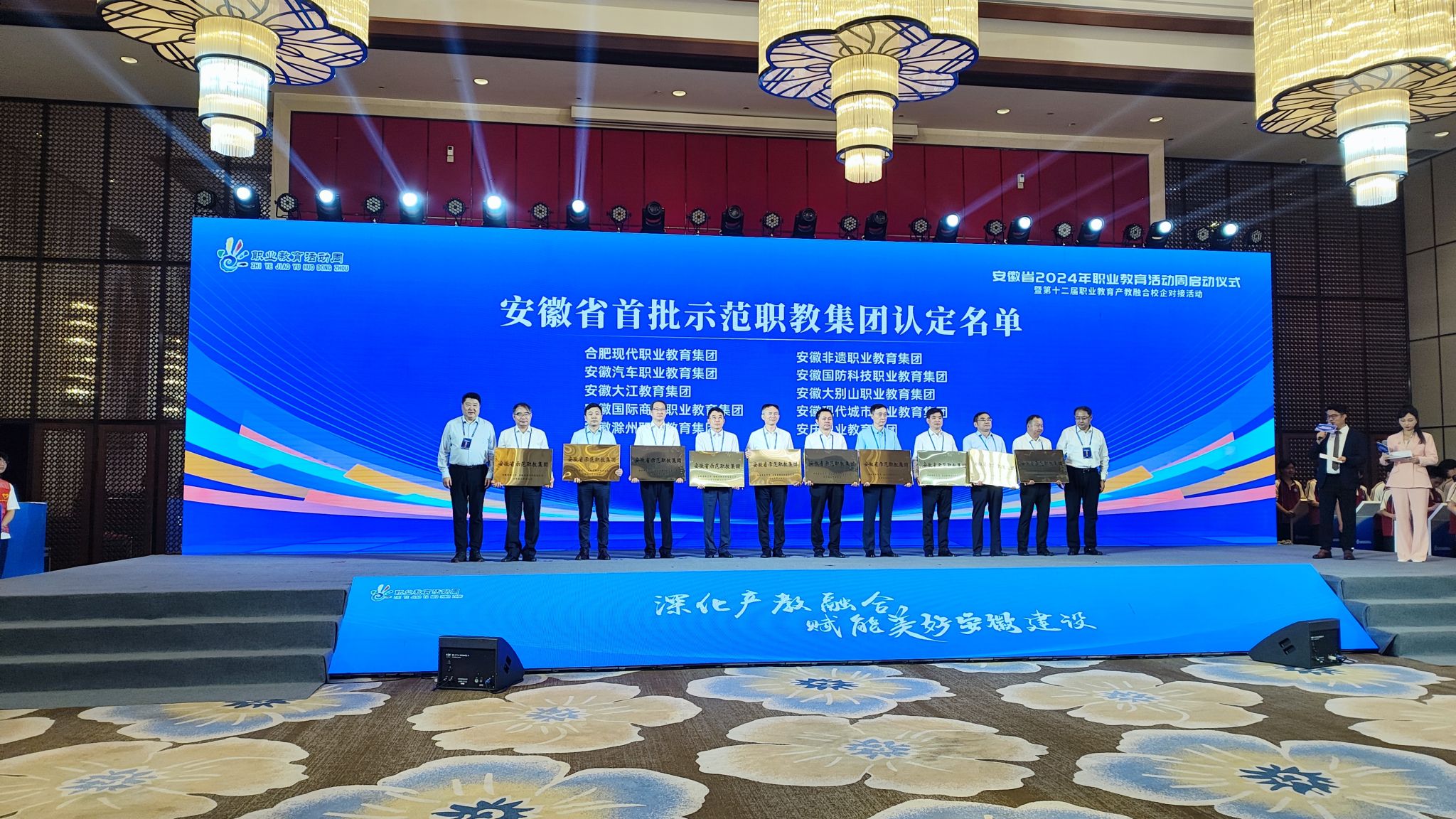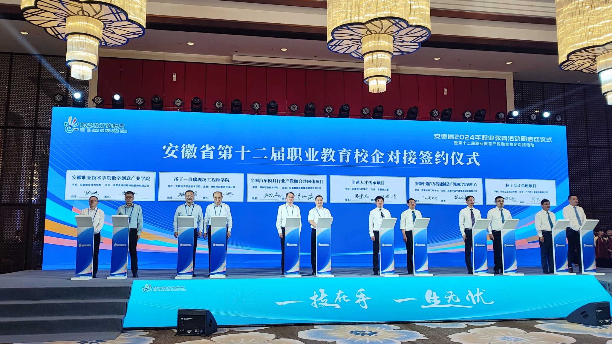 安徽省2024年职教活动周的主题为“深化产教融合,赋能美好安徽建设”。启动仪式上,宣读了安徽省第三批优秀(A类)中等职业学校、安徽省首批示范职教集团认定名单并授牌,宣布了安徽省首批市域产教联合体培育项目名单、安徽省首批行业产教融合共同体培育项目名单,举行了安徽省第十二届职业教育校企对接签约仪式等活动。 安徽滁州职业教育集团被认定为安徽省首批示范职教集团,beat365中国唯一官方网站牵头申报的滁州市域产教联合体被立项为省级首批市域产教联合体培育项目,与合肥工业大学牵头申报的全国智能家电制造行业产教融合共同体和全国汽车模具行业产教融合共同体、与安徽科技学院牵头申报的长三角健康食品行业产教融合共同体获批省级首批行业产教融合共同体培育建设项目。许雪峰代表职教集团、学校上台领奖,并与安徽鲲鹏装备模具制造有限公司,签订了校企合作协议。