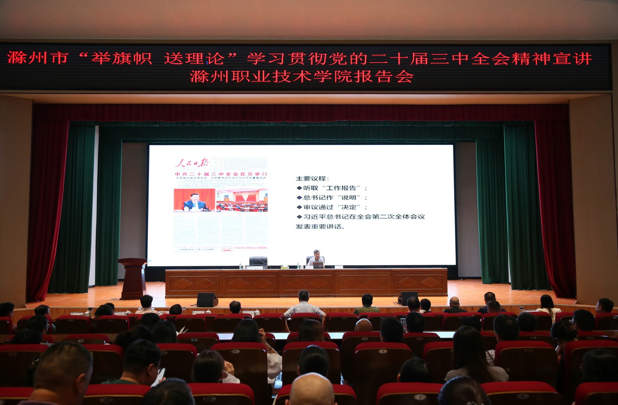 8月26日,365官网在六号实训楼报告厅举行“举旗帜·送理论”学习贯彻党的二十届三中全会精神宣讲报告会。滁州市委党校马克思主义基本理论(党史党建)教研室主任李邦松副教授作党的二十届三中全会精神专题宣讲。校党委书记曹付忠主持报告会,校党委副书记、校长许雪峰,校党委副书记杨家庆,校领导江洁、孙静、苏有良、胡凼、李平权、李超、王冬、王宇出席报告会,365官网全体党员教师参加报告会。