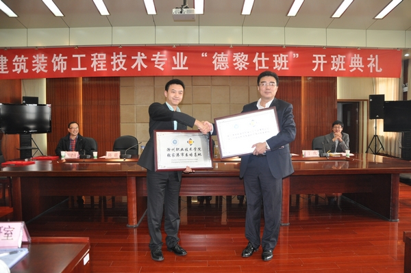 德黎仕总经理刘军浩对“德黎仕班”首批学生提出了“两个自信”和“三个结合”,即“自信”“自强”和“理论与实践相结合”“情商与智商相结合”“竞争与合作相结合”。他对建筑装饰工程技术专业的发展前景充满信心,希望同学们满怀专业情感、用心对待专业学习。