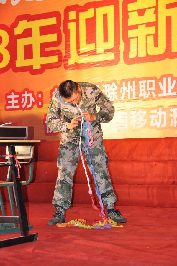王志斌教官上台表演《魔术》之时,新生欢呼雀跃。在表演完“手机变进空瓶里”、“空碗来水”等花絮后,王教官又为大家表演了套铁环、空袋出礼盒等近景和扑克牌等远景魔术,在由新生随意洗过的扑克牌中,王教官拿起密封袋中的预言,“正面向上的牌23张”“黑色牌10张,红色牌13张”等预言皆被言中,现场更有新生上台助阵观摩,一直在旁边观看的主持人张森大呼“王教官帅呆了!”,台上台下的欢呼惊叫声将晚会推向了高潮。