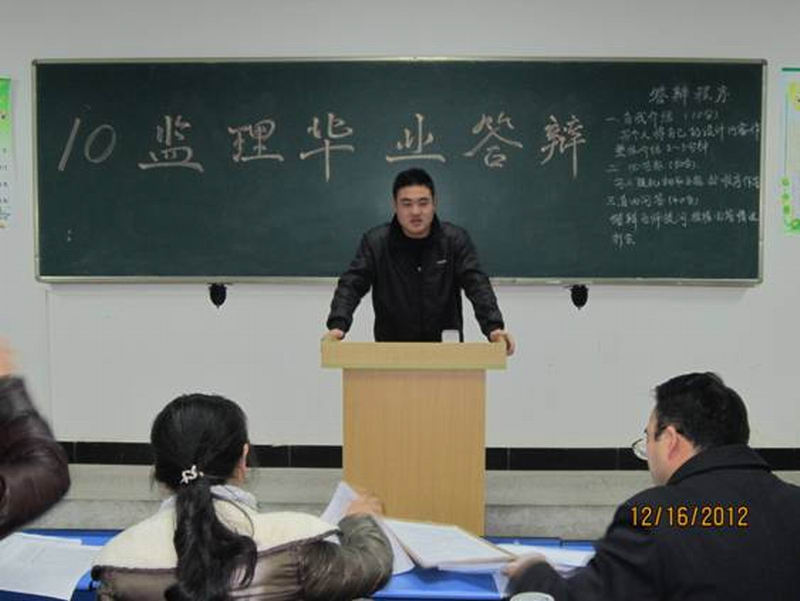 经过5周的毕业设计,12月16日土木工程系10级工程监理专业毕业答辩正式开始,答辩分两组分别在4201及4202教室举行,参加此次答辩的老师有第一组朱永祥主任、陈燕老师和李延老师;第二组胡孝华老师、冯环老师和张勇老师。