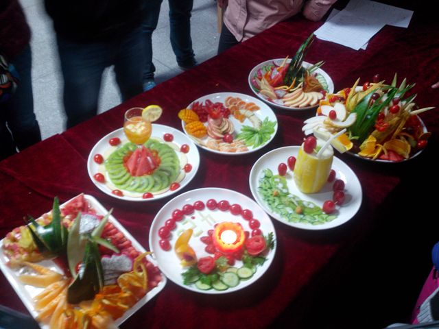 比赛当天虽然是阴凉的下雨天,却掩埋不了同学们参赛的热情。比赛现场,学生会的干部一个个忙着分发水果;选手们则一个个厉兵秣马,摩拳擦掌,跃跃欲试。以前常见别人做的水果拼盘精致美丽,今天难得有这么好的机会让自己大显身手,选手们的心情都很激动。比赛结束后,同学们纷纷表示,当我们用发现的眼光去观察生活,用勤劳的双手去创造生活,我们就会懂得:美丽的生活源至我们的双手。