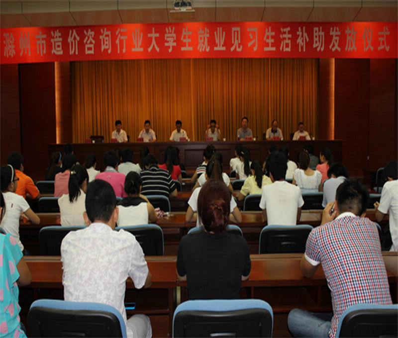 8月30日下午,滁州市造价咨询行业高校毕业生就业见习生活补助费用发放仪式在市建委二楼会议室举行。市建委、市造价站、市造价协会、beat365中国唯一官方网站土木工程系领导出席了发放仪式。全市造价咨询企业负责人、党支部书记和就业见习高校毕业生共60多人参加了仪式。