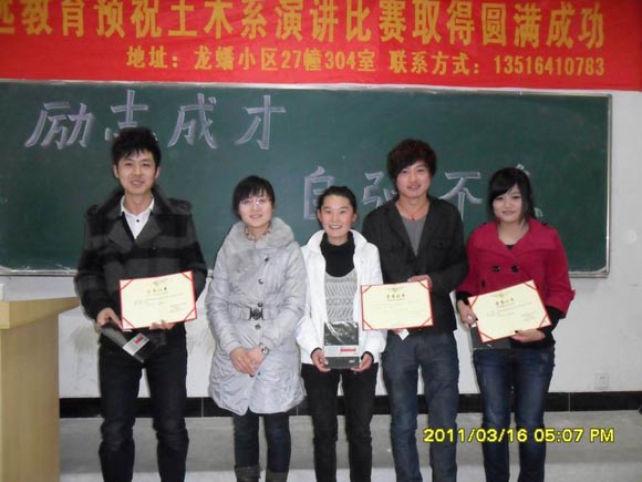 为了深入宣传国家对高校学生经济困难补助政策,激发学生发奋学习、锐意进取、回报社会的热情,3月16日,土木系在阶梯教室举办了“自立自强、励志成才”演讲比赛。比赛共有24名选手参加,由安庆云、汪雪梅等四位老师和学生会部分干部担任评委,比赛过程中,选手们激情澎湃的演讲,感染了在场的所有观众。通过这次比赛,展现出我系大学生青春洋溢的风采,表达了他们励志成才、报效祖国的决心。经过初赛、复赛,共有八名选手脱颖而出,获得一、二、三等奖,成绩公布如下: