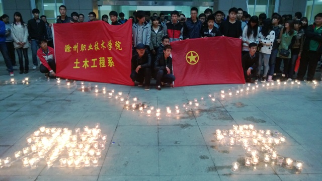 4月22日晚上,土木系的学生们和全院各个系部的同学们一起,点燃起百余支蜡烛,将蜡烛摆放成“心”形和“4·20”形,为灾区祈福。