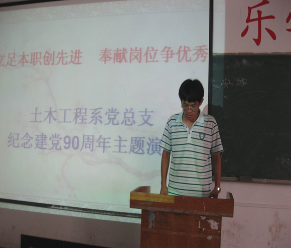 6月23日下午,土木工程系在4101多媒体教室举行了一场“立足本职创先进、奉献岗位争优秀”的主题演讲活动,系总支全体党员及学生入党积极分子参加了本次演讲活动,活动由系学生支部书记吴铭老师主持,学生党员刘云龙、赵维诚结合学生学习作了精采演讲;汪雪梅老师演讲的关于歌颂沈浩的电视剧《永远的忠诚》观后感引起了全场师生共鸣,活动在雷鸣般的掌声中结束。