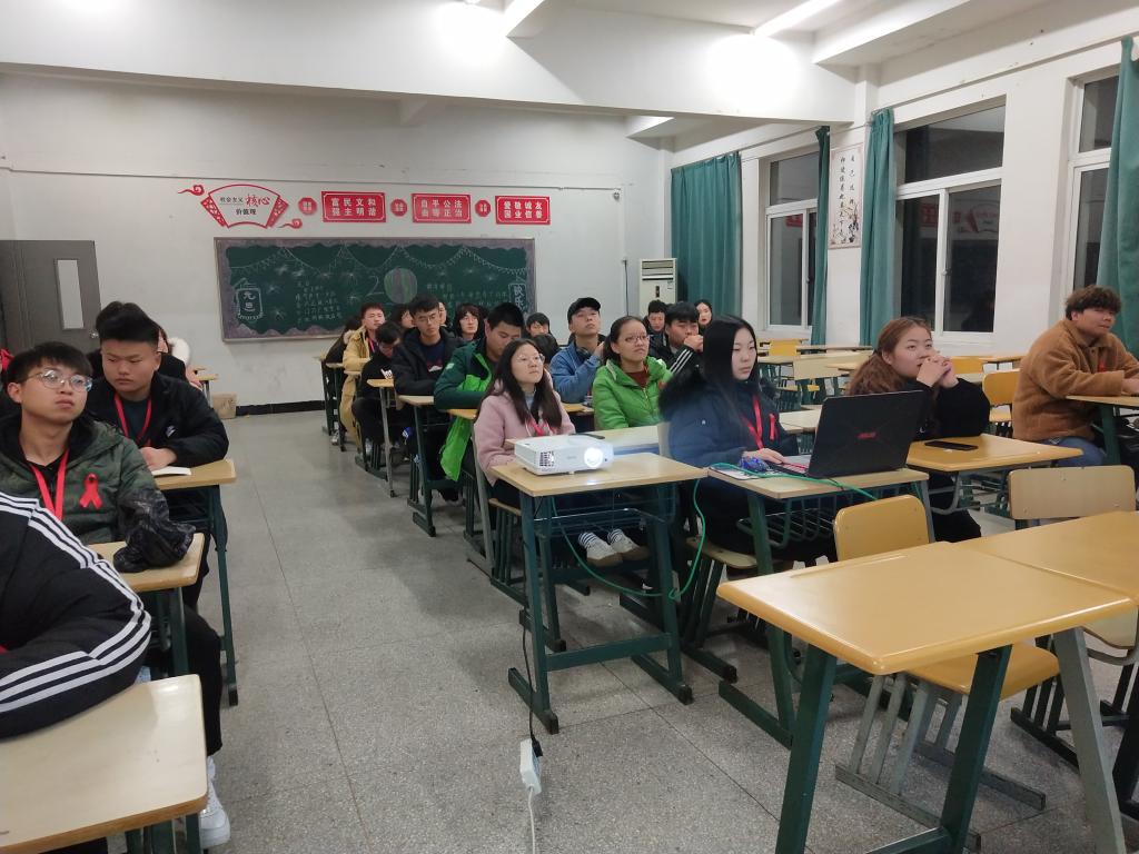 活动开始前,团总支副书记刘畅组织干事为大家发放了艾滋病胸标,点明此次活动的主题。活动中,由19级团支部书记钱召阳主持,以PPT的方式为大家讲解了艾滋病的主要内容,用真实的案列、大量的数据、图片和现场演示讲解出何为艾滋,怎样预防艾滋,让同学们更加深入的了解艾滋病,并意识到预防艾滋的重要性。