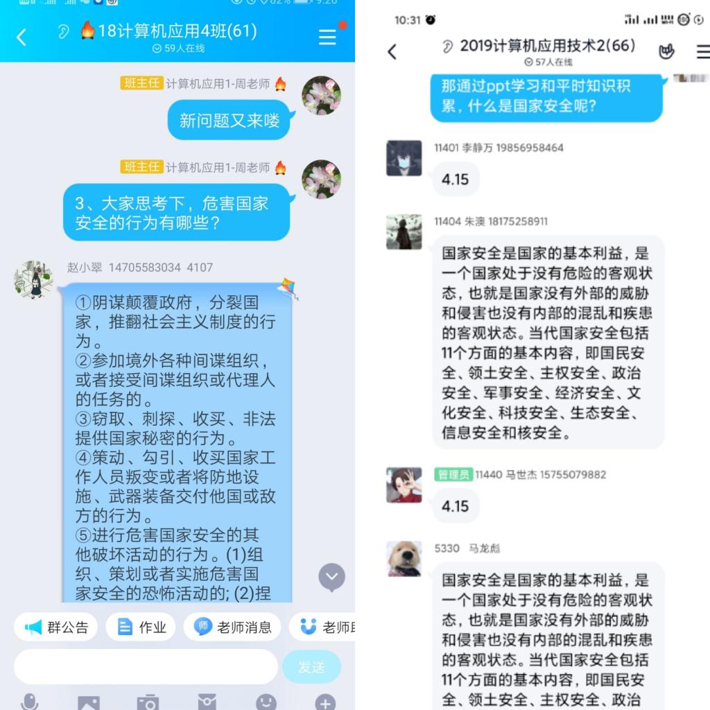 我院各班级的主题班会,辅导员以国家安全为切入点,利用视频、PPT等形式带领同学们了解国家安全概念、国家安全形势、普及国家安全法律常识、对国家安全法治进行宣传教育,提高国家安全法治宣传的影响力和传播力等,旨在提高同学们维护国家安全的意识,培养同学们履行维护国家安全、保守国家秘密的自觉性和主动性。班会的同时,鼓励同学们就现阶段疫情防控安全问题展开研讨交流,表达自己的认知和感受,加深同学们对国家安全不同方面的了解。会后,我院各班辅导员鼓励学生积极关注“中国大学生在线”微信公众账号,参与“全国大学生国家安全教育知识竞赛”线上答题,巩固相关知识。