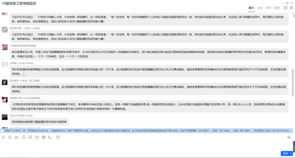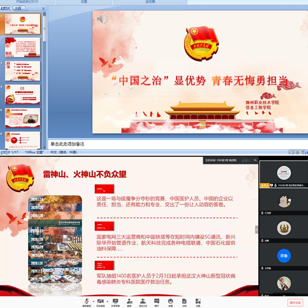 为了激发同学们的爱国主义情怀,增强青年学生的责任担当意识和抗疫决心,5月8日,信息工程学院团总支通过腾讯会议召开了“中国之治显优势 青春无悔勇担当”线上主题团课,团总支全体成员参加学习,会议由团总支副书记刘畅主持,19计应3班团支书钱召阳主讲。