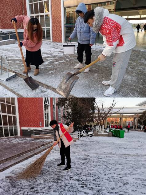志愿小分队拿着铁锹、扫帚等工具采用“分工配合,轮流作业”的工作模式,不畏寒冷,怀揣着满腔的热情,积极投身于清冰铲雪活动中,着重对致善楼前的主干道和易滑路段进行清扫。火热的劳动场面赢得了路过师生的驻足称赞。