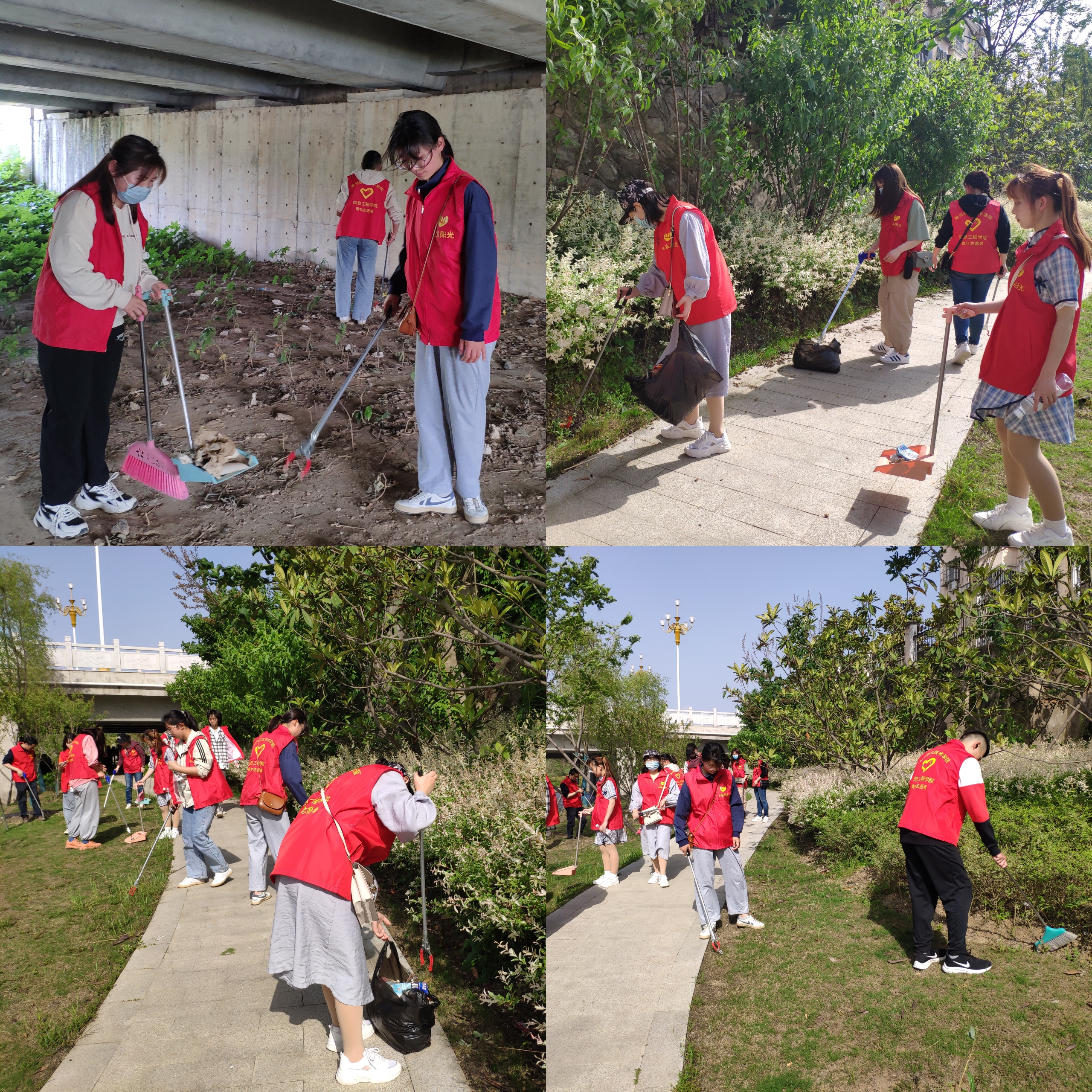 活动中,学生志愿者在社区工作人员的带领下来到了内城河公园绿道,一到地点,同学们们自己分组,发扬拿着簸箕、扫帚、夹子或垃圾袋等卫生工具,齐心协力、互帮互助、分工有序地捡拾散落在河岸边、草地上的烟头、树叶、果皮等垃圾,并统一放在垃圾袋里。经过同学们近一小时的努力,公园绿道变得整洁干净,河岸边环境焕然一新,也赢得了社区工作人员的夸奖称赞。