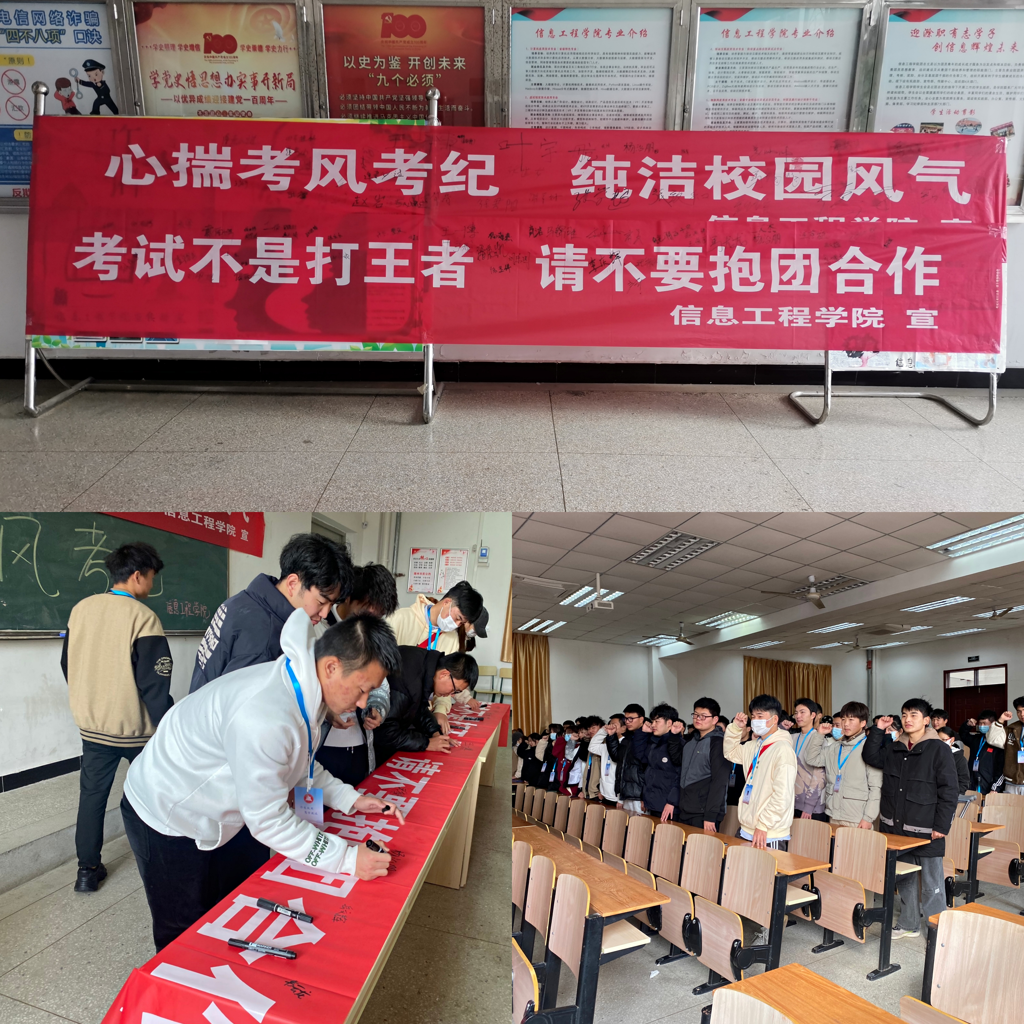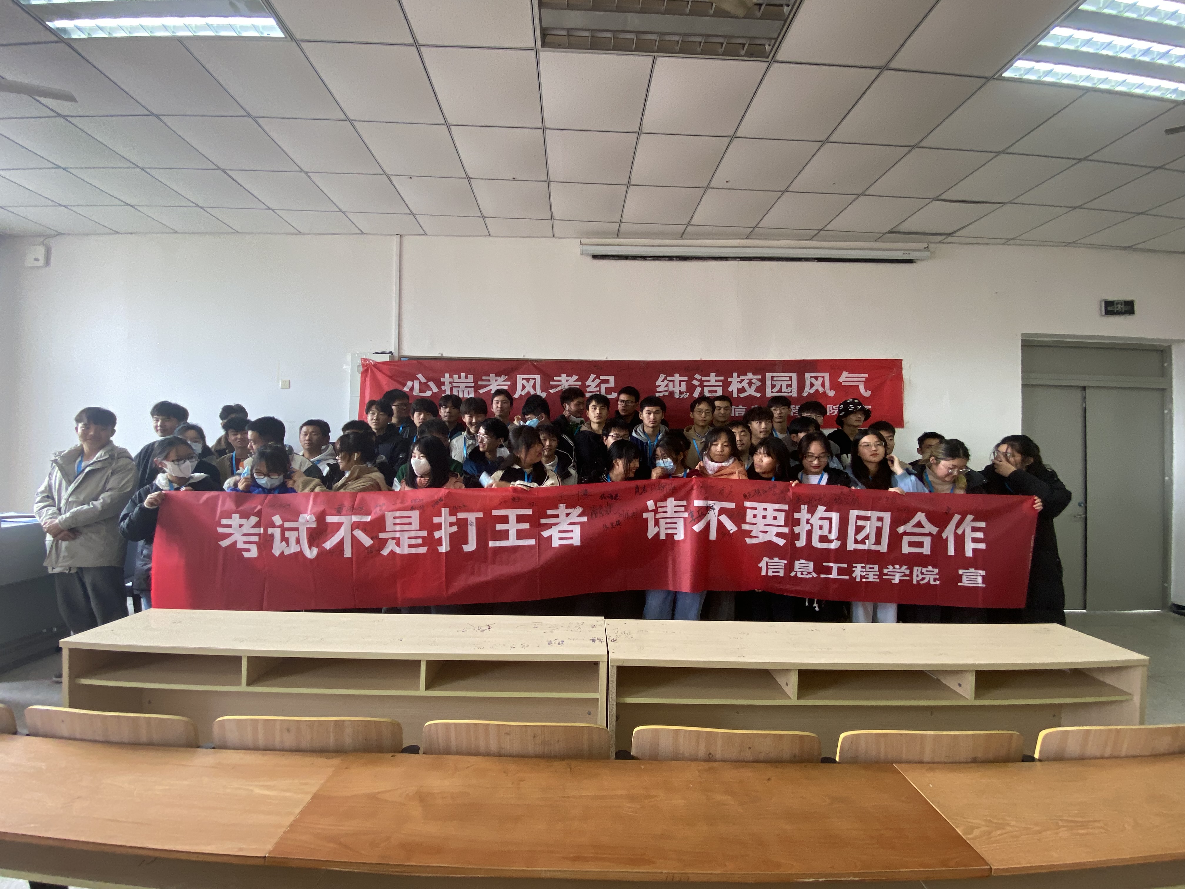 期末考试临近,为树立优良学风,加强考风考纪建设,营造良好的考试氛围。信息工程学院于12月15日在南阶103开展了“文明考风,诚信考试”主题签名活动。