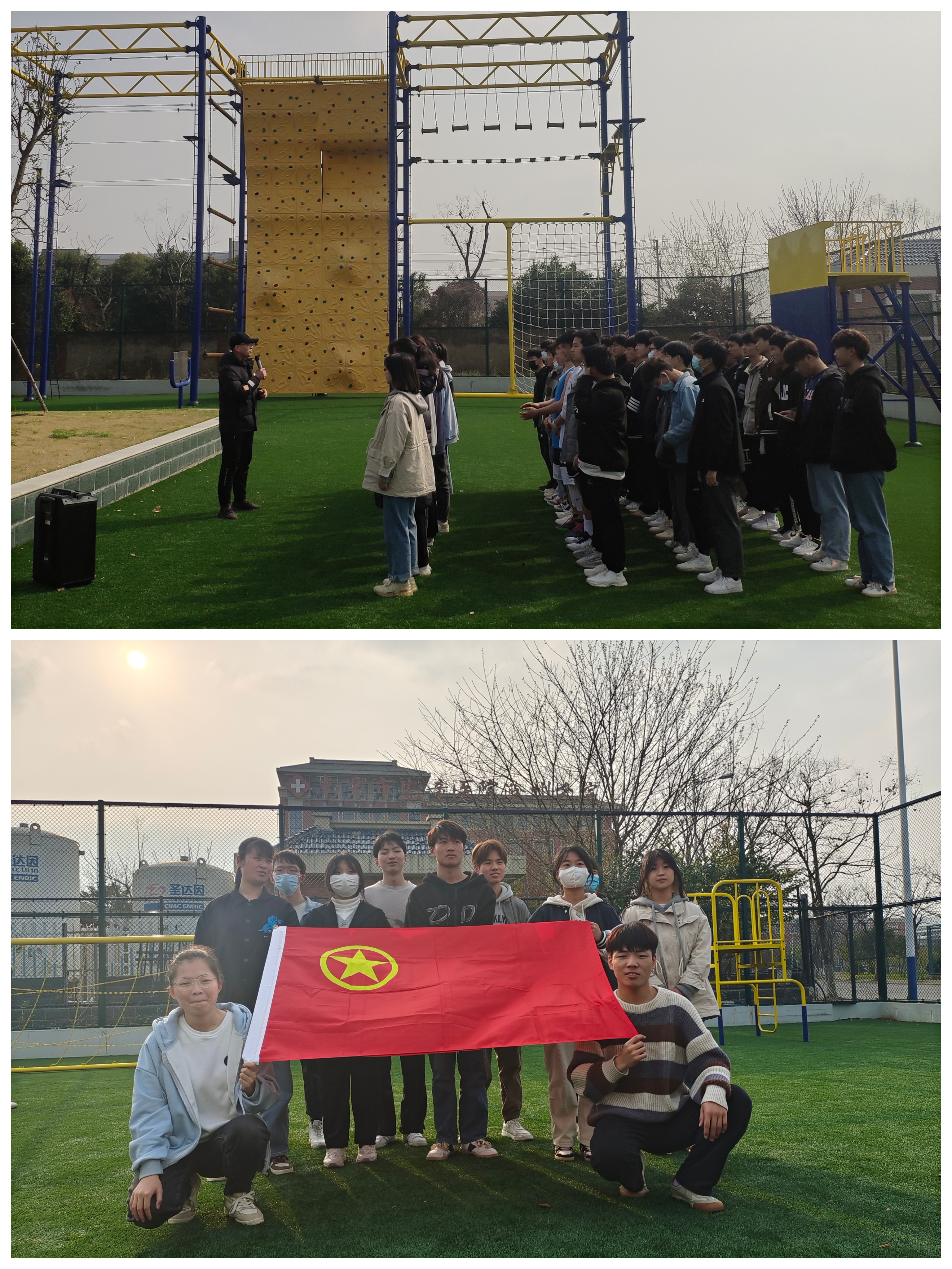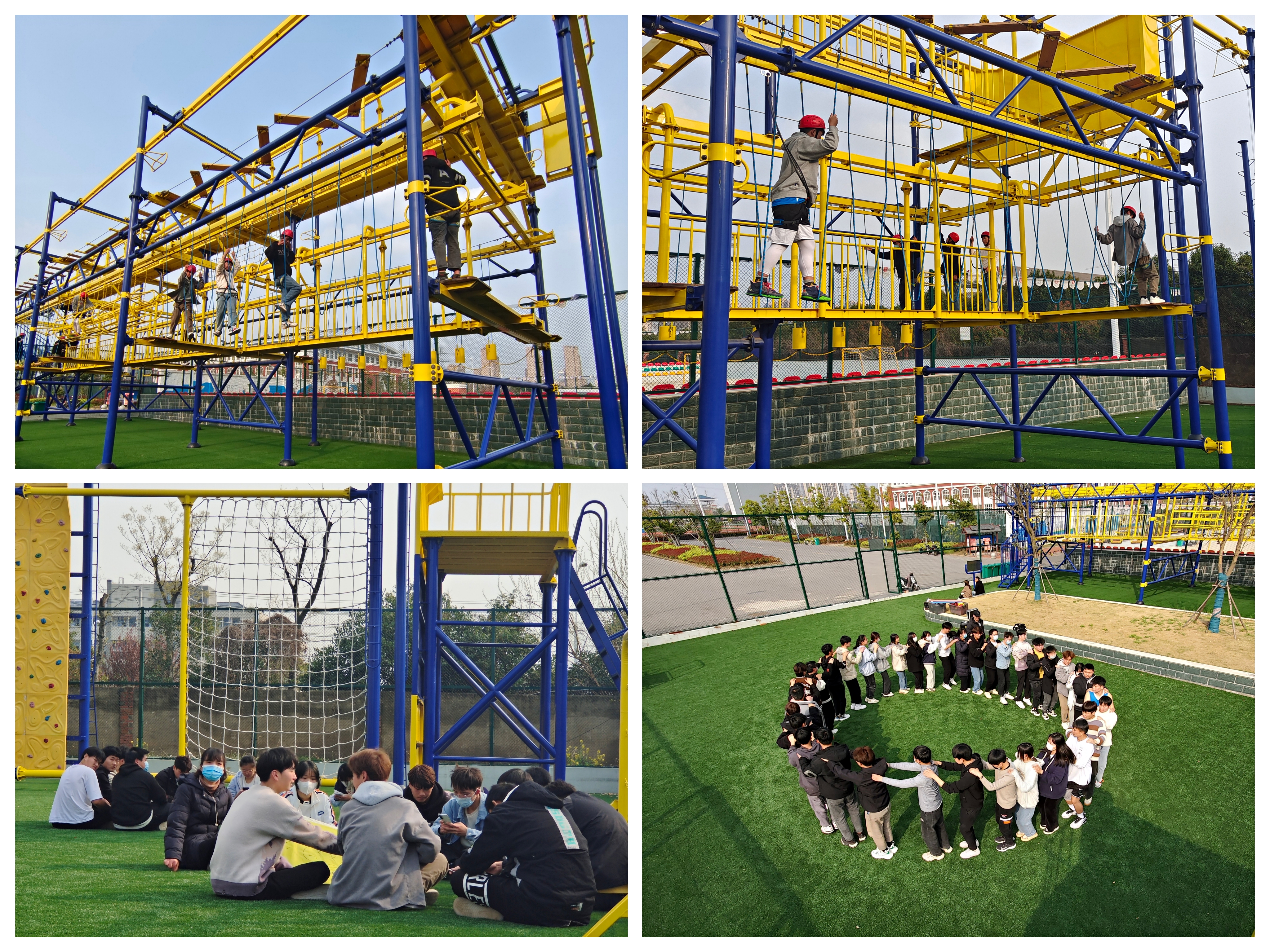 活动伊始,体育部申圳老师介绍了本次培训的目的意义和具体流程规则,希望同学们能积极参与、认真观察、勤于思考、用心感悟。接着,老师带领同学们开始了本次的主题素质拓展活动。本次活动包括“破冰游戏——罗杰斯交朋友”、“团队智慧——九宫格喊数”、“团队合作——传球接力”、“团队分享——配对游戏”四个游戏及“突破极限,挑战自我”高空探险项目。同学们在游戏中相互配合,相互鼓励,积极互动,破解难题,同时认真分享个人体验,加深了彼此之间的关系,增强了团体合作默契,提高了对团体素拓的认识和了解。而高空探险项目更是让同学们突破了自己的极限,有的甚至了克服了恐高症,真正做到了“突破极限,挑战自我”的精神。