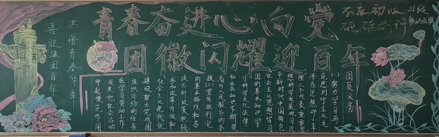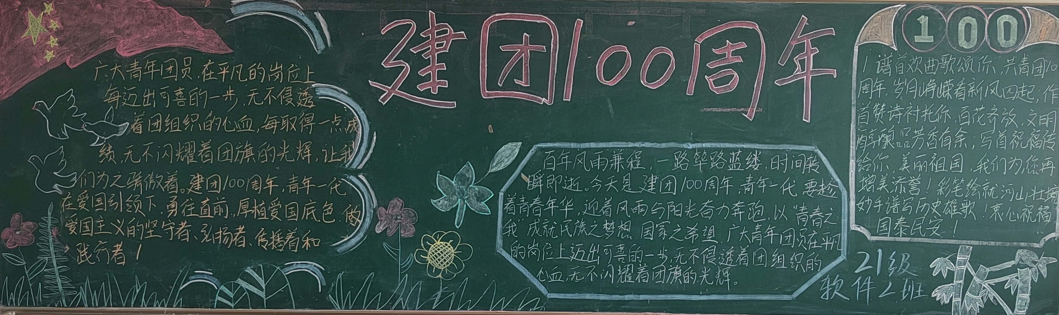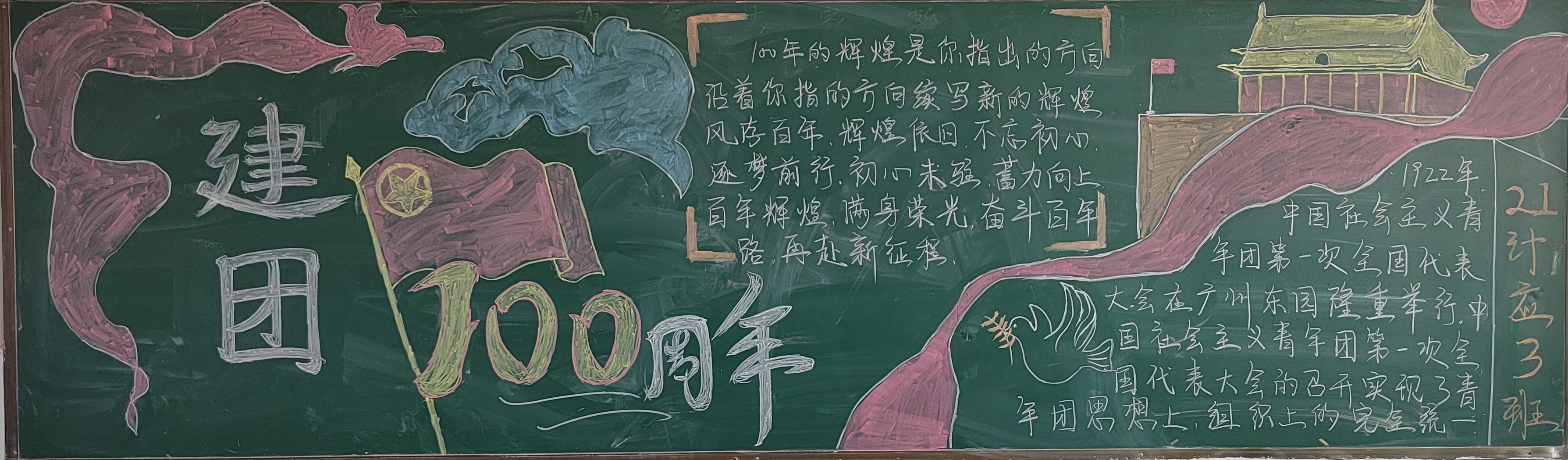 为庆祝中国共产主义青年团成立100周年,深化我院青年学生对共青团悠久历史和光荣传统的认识理解。5月4日下午,信息工程学院学生会开展了以“建团百年绽芳华 共绘蓝图迎盛世”为主题的建团百年黑板报评比活动,带领团员青年重温百年团史,传承红色基因。