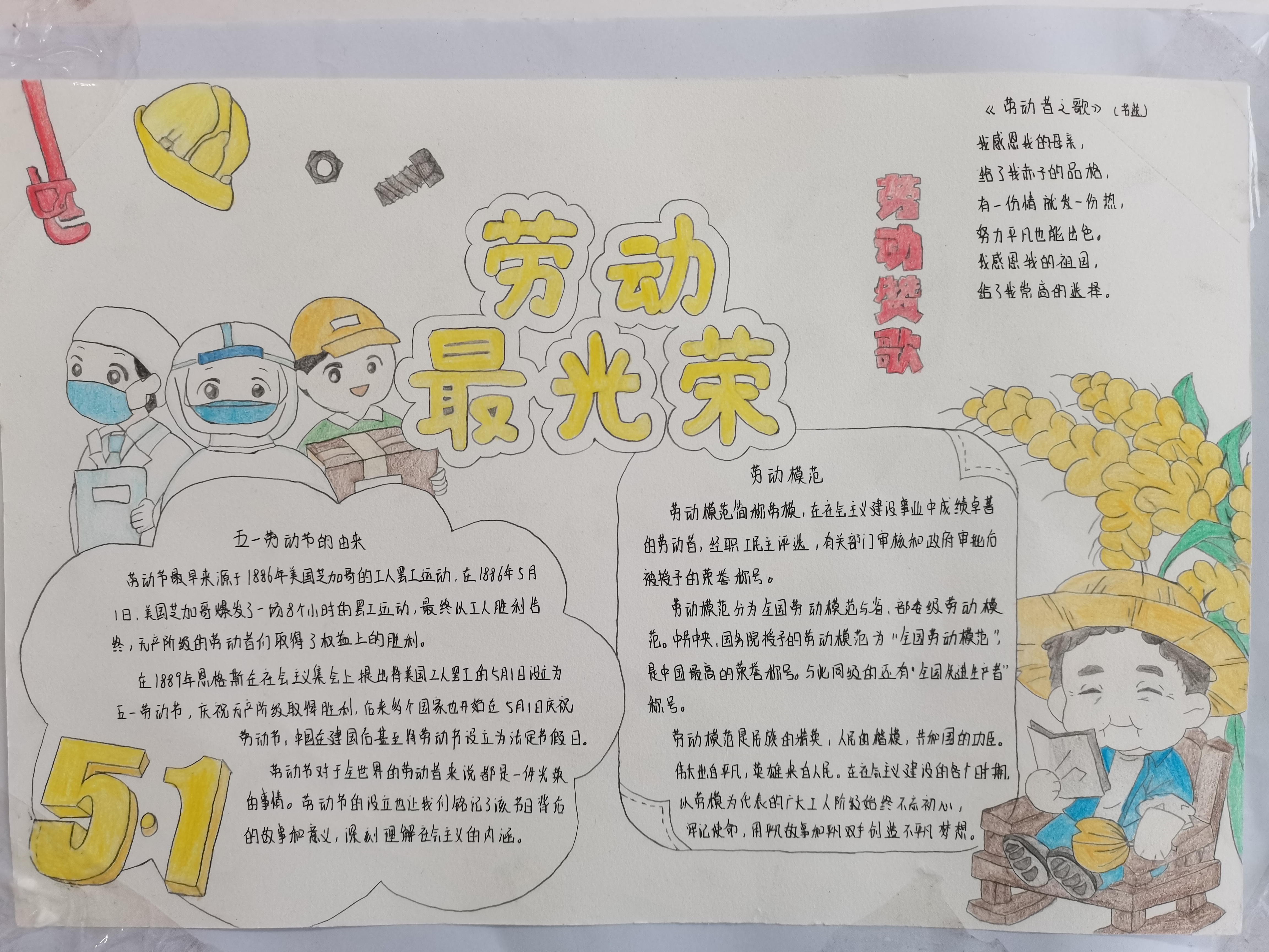 此次评选活动得到了同学们的热烈响应,在团总支副书记王乐的发动和指导下,同学们积极参与,利用课余时间,紧紧围绕“劳动最光荣”的主题,自己动手、动脑、绘画、制作出一张张生动有趣、个性鲜明、内容丰富的手抄报。参赛作品有的描述结合疫情画出了最美逆行者,有的描绘了劳动者们的身影,有的介绍“五一”节的来历,赞美劳动光荣,讴歌劳动创造幸福生活,都用最绚丽的图案和最真实的情感,展示了“劳动最光荣”的生活态度。