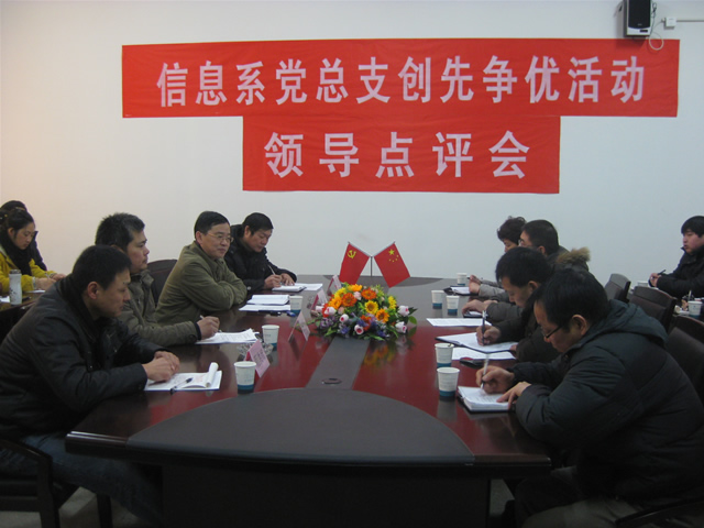 首先程洪斌书记就信息系党总支创先争优前段时期的工作作了汇报,听取报告后院长李柱梁同志对信息系创先争优活动进行了现场点评。