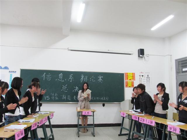2011年5月25日,信息系2011年大专辩论赛决赛于2502教室激情上演。我系党总支程洪斌书记、团总支杨阳书记、辅导员李红艳老师、班主任李彬老师、班主任李兰兰老师和学会生会主席团一起共同担任了比赛评委。比赛中,10级计算机系统维护班和10图形图像班就“竞争与合作谁能使文明更进步”这一辩题展开了激烈的辩论,最终10图形图像技高一筹取得冠军。