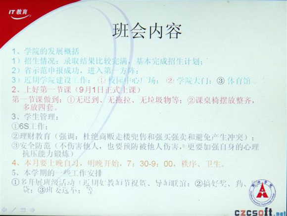 “年年岁岁花相似,岁岁年年人不同”,新的学期又开始了。新学期的开始,意味着新的希望、新的憧憬和新的征程。八月三十一日,信息工程系08、09各班为圆满妥善安排好新学期的各项工作,在统一部署的基础上,相继召开了班会,围绕学院的发展目标和总体要求,宣讲学院发展的形势和当前的重点,要求同学们在这一良好的大好形势下抓住这宝贵的今天,积极锻炼自己,努力成才,去创造美好的明天,让家长、学院、社会放心。