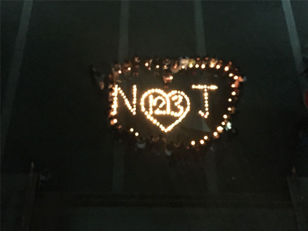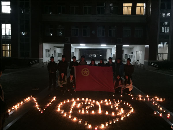 我系学生在2号楼下摆上一支支蜡烛。蜡烛被围成一个爱心,中间写着12•13,两侧分别摆成“N”“J”2个字母代表“南京”二字。主持人介绍南京大屠杀的历史,告诫同学勿忘国耻,发奋图强。在场的每一名同学手中捧着一支蜡烛,为“南京大屠杀”的死难同胞默哀三分钟。摇曳的烛火不停地闪动,映照在每一个在场同学的面前,曾经的历史似乎又再现在眼前。