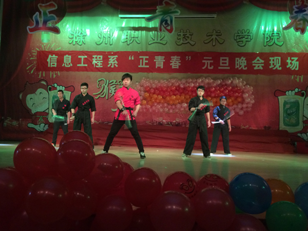 武术表演也是精彩纷呈。《太极》中的动作圆润连贯,招招式式所展现的风采令人歆羡不已,步步轮轮所流露的风采使人无法忘怀。《双截棍》的表演激情四射,仿佛让大家走入时代的动感地带。当表演者武起闪动着的双截棍,礼堂灯关闭,转动的闪动双截棍引起晚会的又一次高潮,欢呼声和掌声像潮水般响彻在礼堂上空。