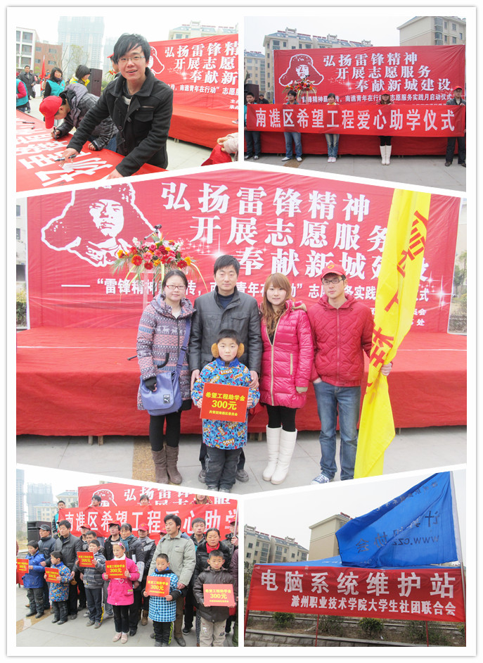 2012年3月3日上午,信息系志愿者小分队跟随大学生社团联合会前往龙蟠小区参加南谯区团委举行的“雷锋精神薪火传,南谯青年在行动”志愿者服务实践月启动仪式,吹响了信息系团员青年“学习雷锋精神,争创先进优秀”五个一活动的号角,拉开了学雷锋志愿服务月的爱心帷幕。
