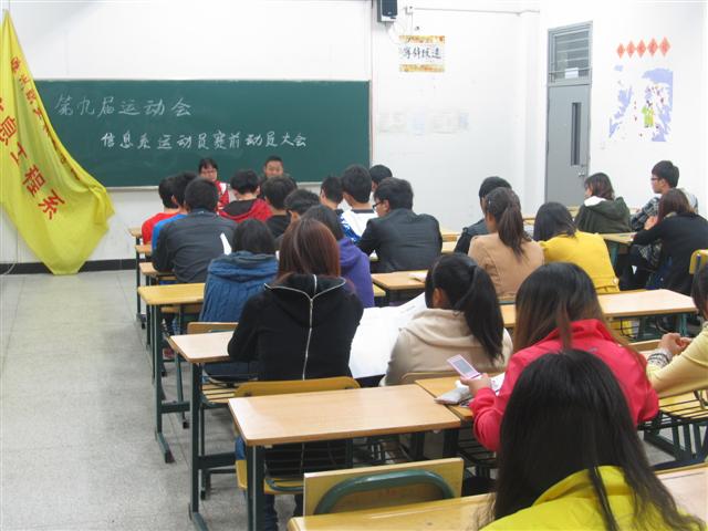 2012年10月30日傍晚,信息工程系团总支召开第九届运动会运动员赛前动员大会。程洪斌书记出席了本次大会。会上程书记要求运动员们注意比赛安全,服从赛事安排,展现大学生的良好风貌和体育精神。随后,团总支和学生会就比赛期间运动员参赛流程进行了细致的安排,确保运动员顺利完成比赛。