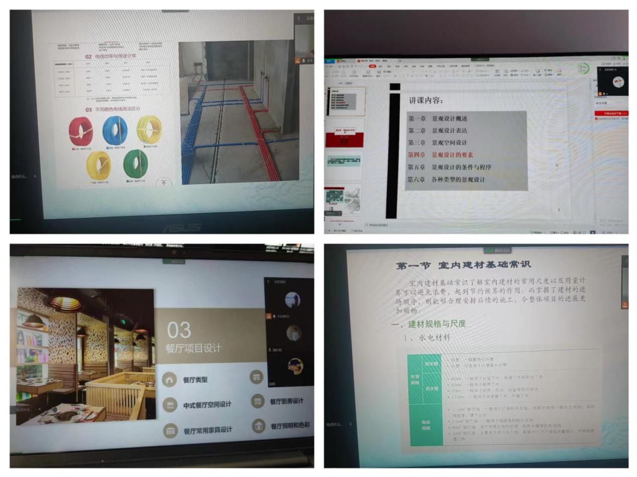 本次线上直播共开设《公共空间设计与实训》《景观设计》《室内设计工作室跟岗实践》《谈单能力与技巧》等4门专业课程,授课教师们运用线上直播、辅导答疑等多种方式组织教学,做到灵活应变。积极使用案例分析、小组讨论等信息化互动工具,引导学生主动学习、交流讨论,为在线课堂增添了许多乐趣,学生学习积极性高、参与率高,取得了线上教学的良好效果。