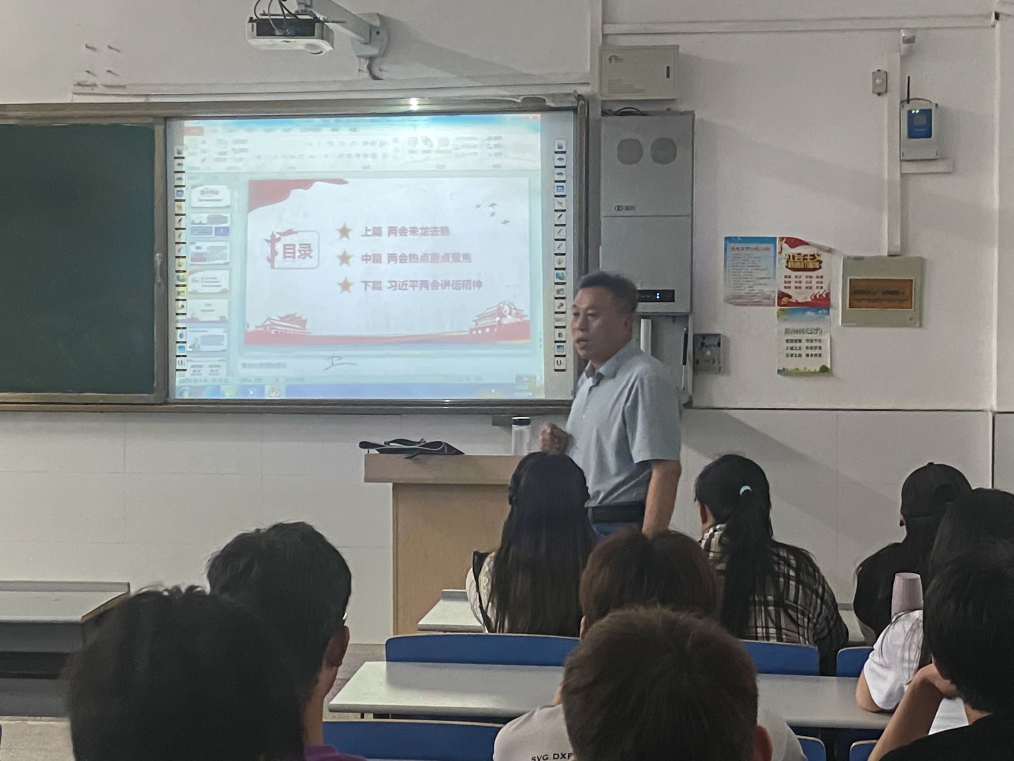 5月30日下午,传媒与设计学院党总支书记王广保在艺102教室,为21传策1班学生讲授《形势与政策》课,带领同学们深入学习领会2023年全国两会精神。