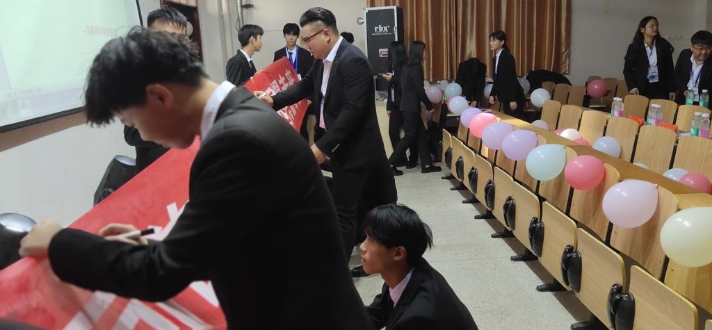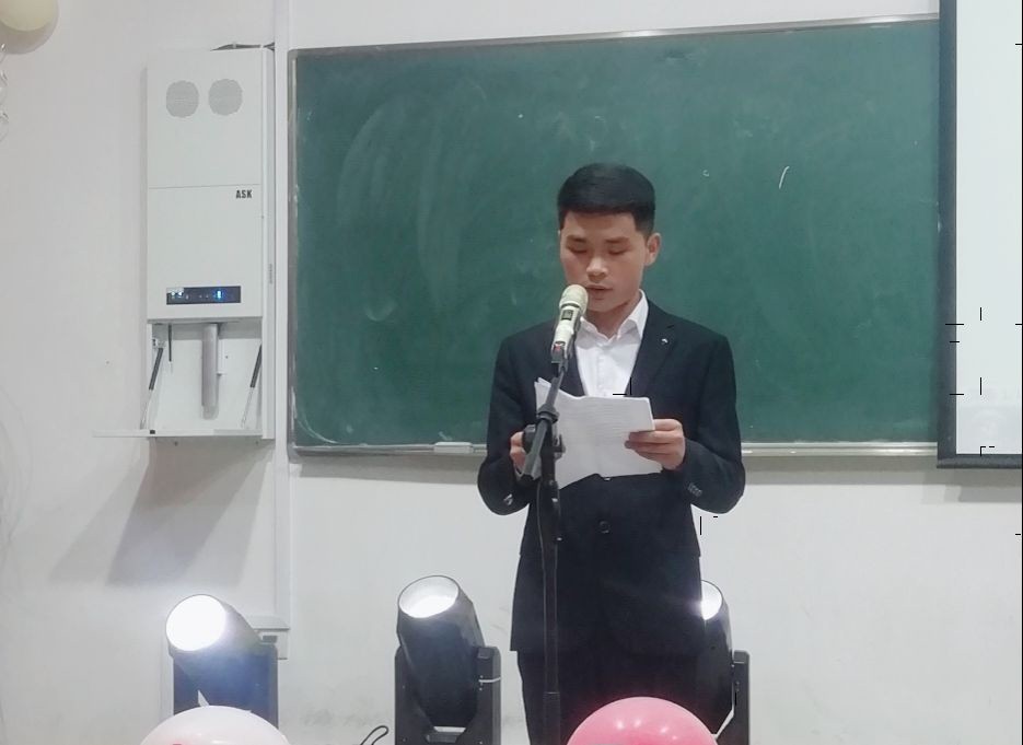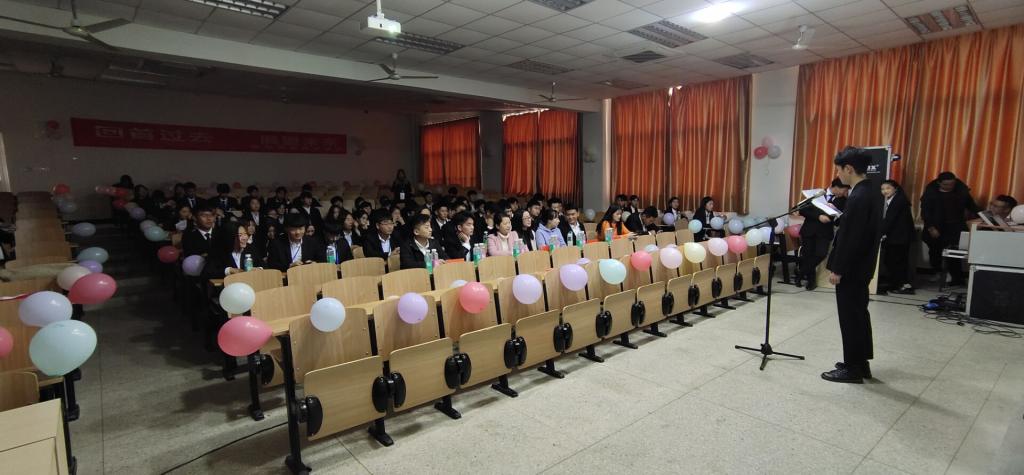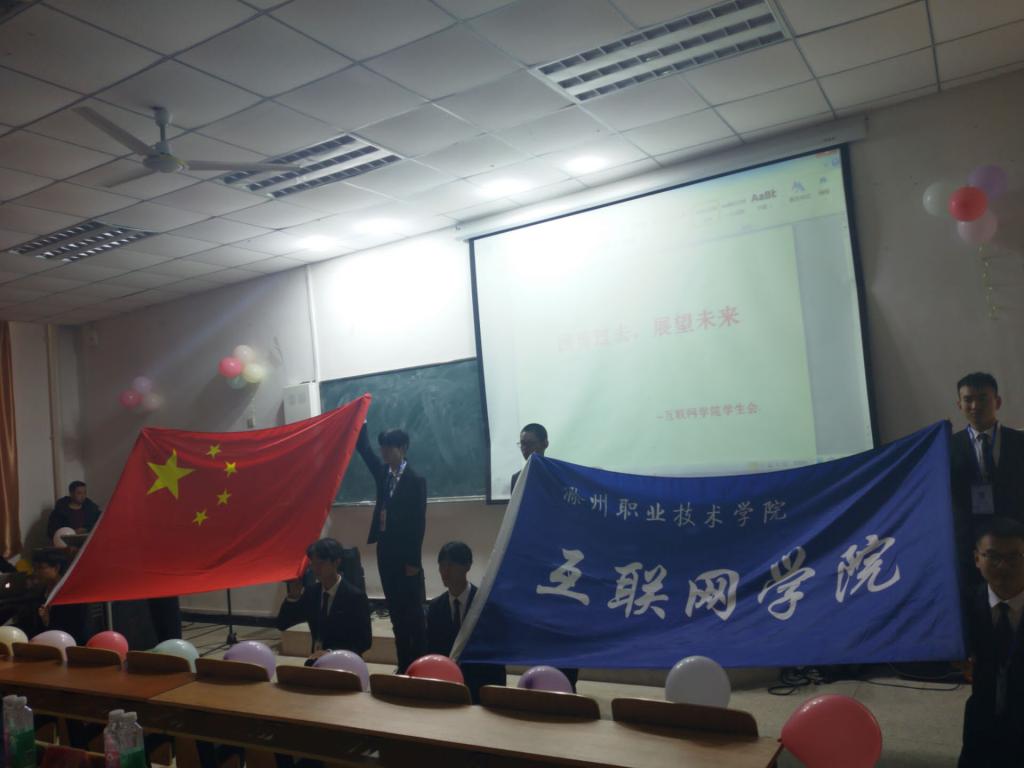 在这个冷冽的天气下,全体成员依旧身着正装出席本次活动,将互联网学院学生会的精神风貌淋漓尽致的展现了出来。当灯光亮起时,主持人走入会场宣布本次活动正式开始。首先由八位同学举着国旗与院旗进入会场,国歌响起全体成员起立行注目礼。随后由主席胡新胜与学生会代表卢凯和学生代表杨晓锐分别发表了演讲。那慷锵有力的演讲使得会场内掌声不断。