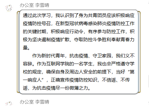 本次主题征文活动,使大家更加了解“五四精神”,更加爱国,也让同学们重温历史,追忆革命故事,传承爱国精神的同时,更要求同学们将艰苦奋斗的精神融入生活之中,肩负起弘扬五四精神和振兴中华的使命,紧跟党的步伐,厚植爱国情怀,强化担当意识,努力将个人的成长融入到实现中华民族伟大复兴中国梦的进程中。