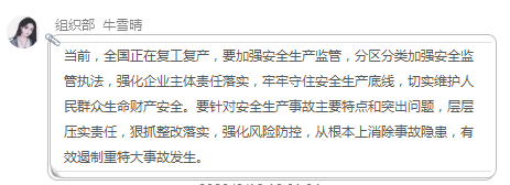 视频指出,要深入贯彻落实习近平关于安全生产的重要指示精神,按照李克强总理批示要求,严格落实安全生产责任制,抓实抓细复工复产安全防范工作。要围绕从根本上消除事故隐患,在全国深入开展安全生产专项整治三年行动。要强化组织领导,把解决问题、推动企业主体责任落实作为整治的关键,进一步完善安全生产执法体系,提升基础保障能力,加强应急处置,扎实推进安全生产治理体系和治理能力现代化,为全面建成小康社会营造稳定的安全生产环境。