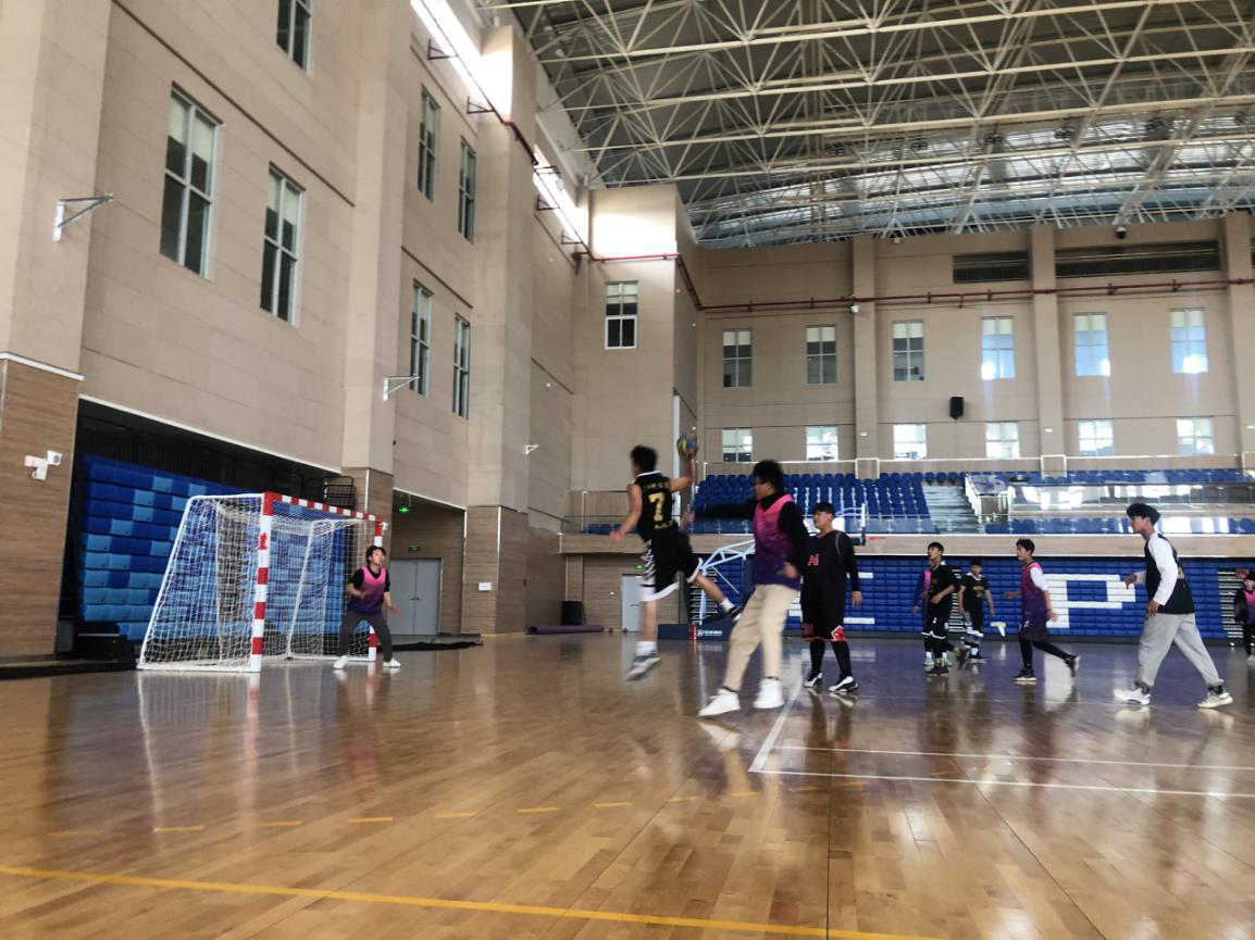 寒冷的天气抵挡不住大家对于手球的热情。两个学院运动队的球员们身穿队服,早早地来到了比赛场地进行赛前热身。