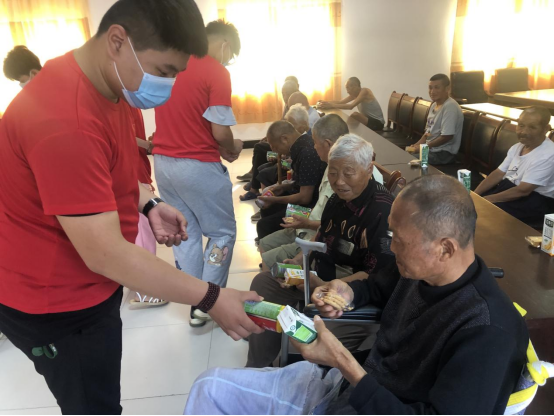 志愿者给他们送去了牛奶、面包、水果等物品,大家坐下来一起聊聊家常,询问老人的健康、关心老人的生活。