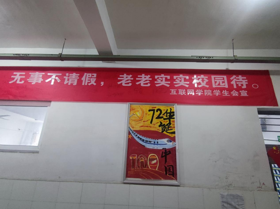 疫情来势汹汹,为了更好地保护校园和学生安全,互联网学院成立了疫情防护小组,以实际行动践行初心使命,用担当作为谱写抗“疫”战歌。同时,互联网学院学生会在教学楼挂上了“戴口罩、勤洗手、测体温、多通风。无事不请假,老老实实校园待”的横幅标语,并且组织同学们进行签名,时刻提醒自己注意防护。