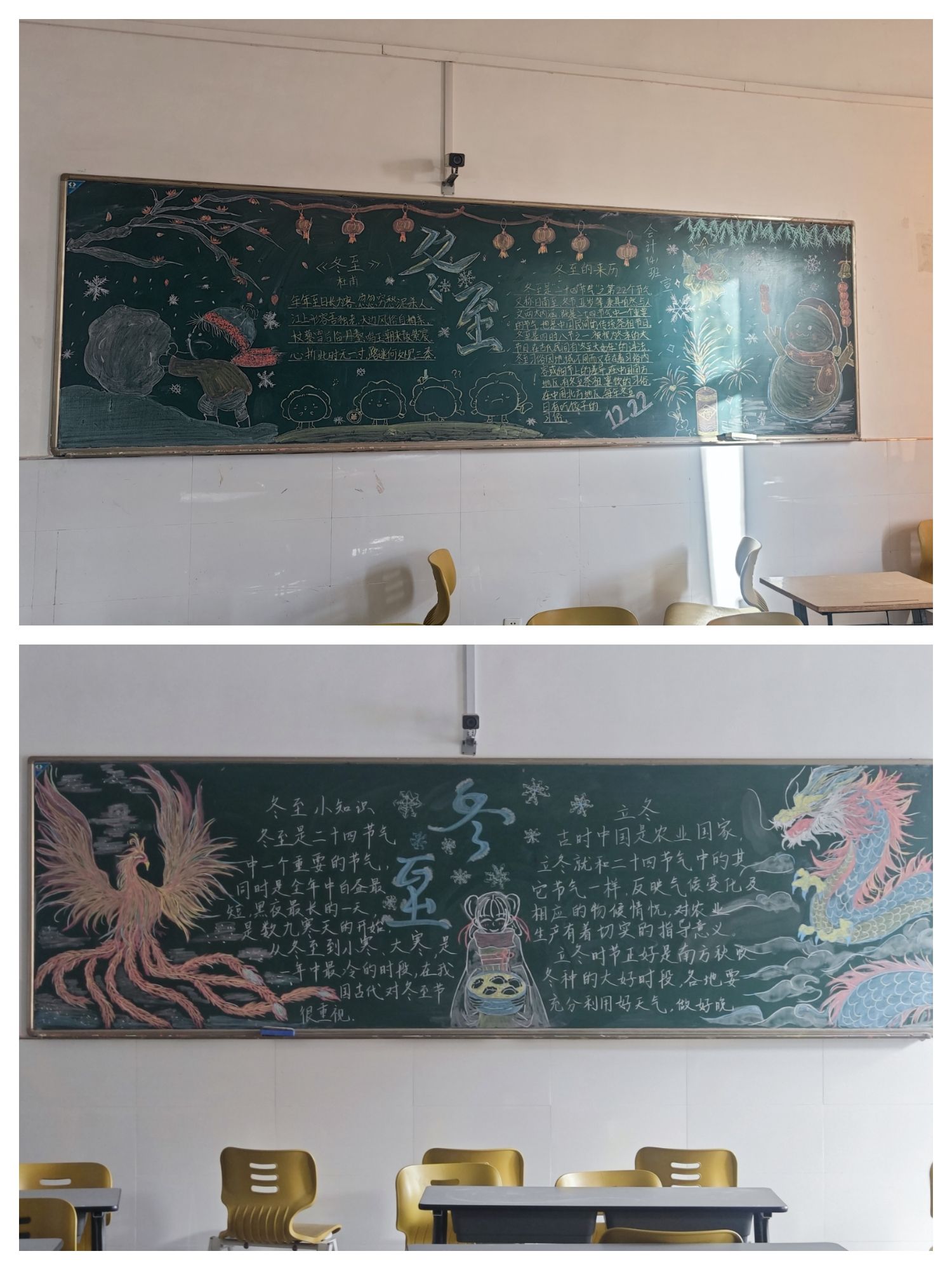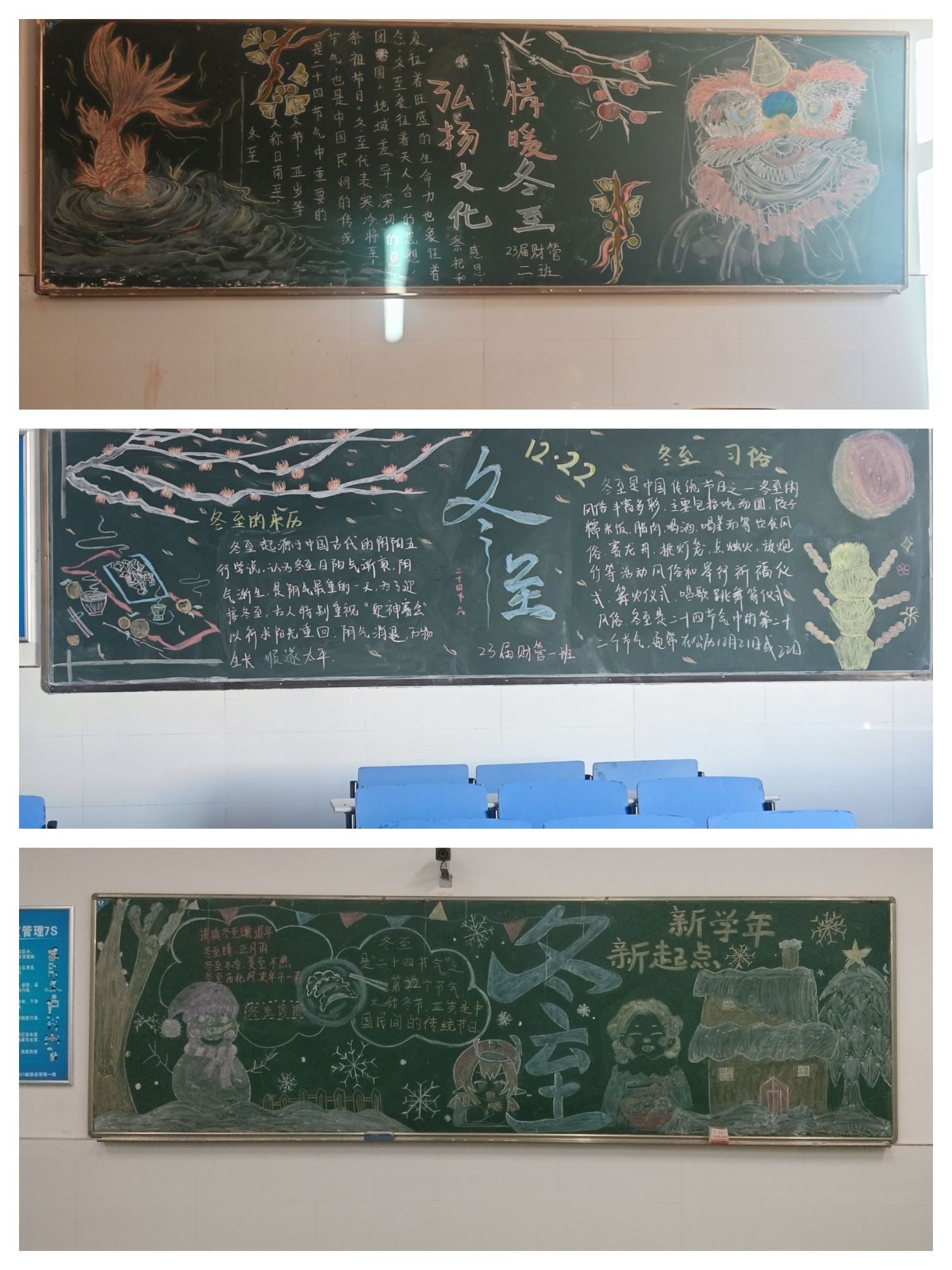 活动正式开始,各班同学迅速投入到工作中。有的负责画画,有的负责写字,还有的负责布局规划。同学们都积极参与,发挥创意,用粉笔勾画出一幅幅排版美观、紧贴主题的黑板报,在班级里营造了浓厚的节日氛围,增添了一份冬至节日的气息。经评比,23会计四班荣获一等奖,23旅管二班、23财管二班荣获二等奖,23旅管三班、23会计一班、23财管一班、23工企二班荣获三等奖。