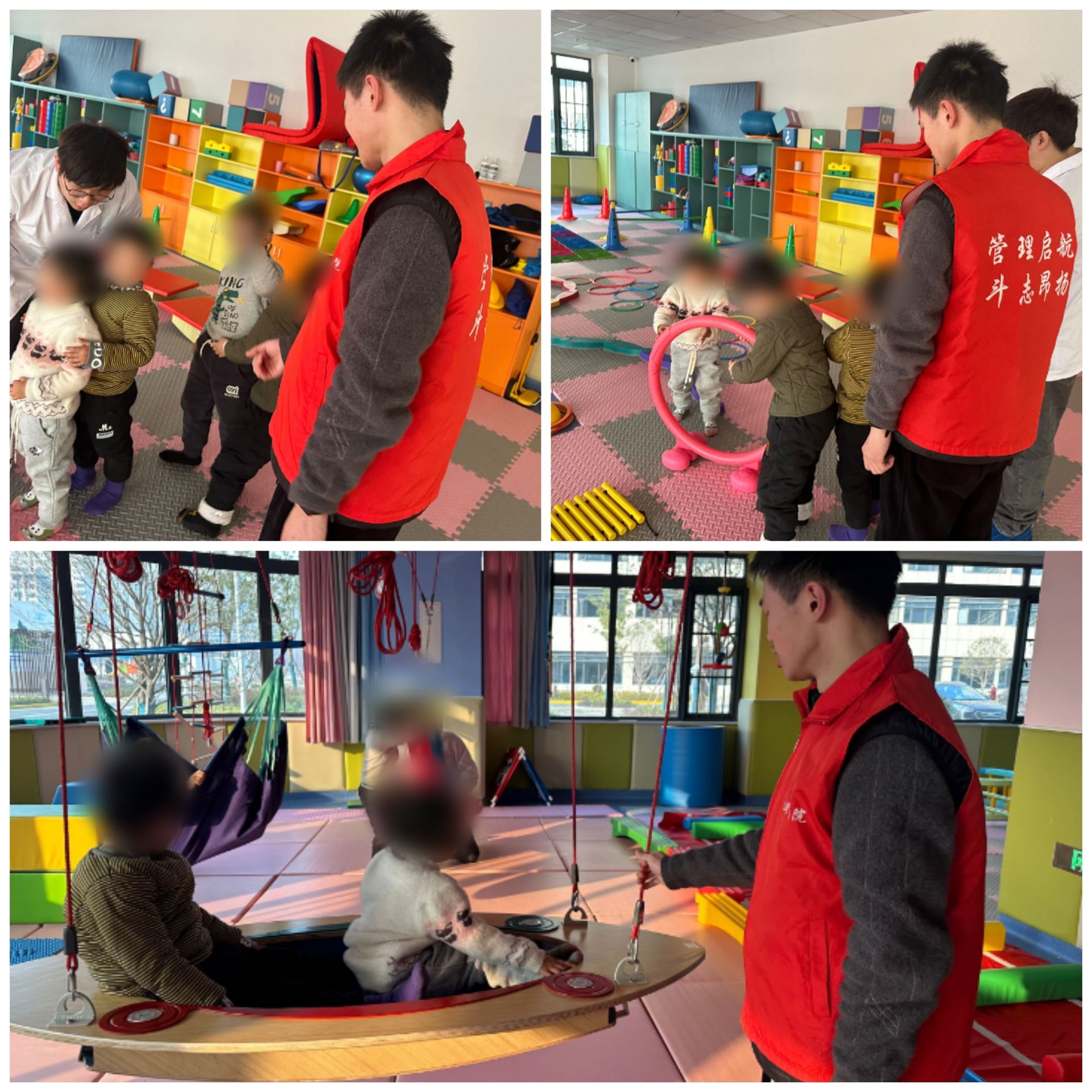 首先,医院医护人员向志愿者们介绍了孤独症儿童相关的知识,随后,志愿者们听从安排,为即将到来的元旦活动做布置,比如贴窗花、吹气球,随后和医护人员一同照顾孩子并陪同孩子做各种康复训练。志愿者们与孩子们一起参与荡秋千、接龙、跳格子等游戏,通过耐心地倾听来自孩子们的故事,与他们分享自己的经历,让孩子们感受到来自社会的关爱和陪伴。