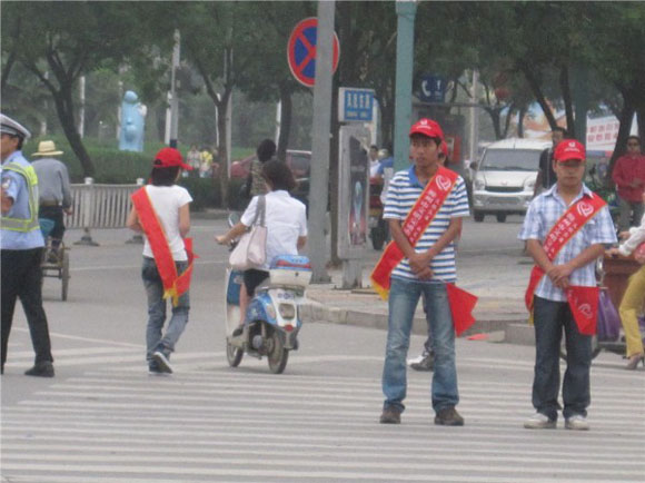 经贸系团总支积极响应此次活动的号召,于9月11号组织了16名志愿者参加了此次活动,他们在人民广场的十字路口进行了将近3个小时的协警工作,主要负责指挥行人及车辆各行其道,劝导机动车有序停放,制止闯红灯,超速行驶等危险驾驶行为。