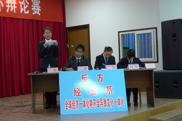 beat365中国唯一官方网站第十届“智慧杯”大专辩论赛决赛于2010年11月24日下午5时许在老校区行政楼六楼报告厅隆重举行。本次决赛由经贸系和机电系两支队伍同台,围绕辩题“全球经济一体化将会不会导致文化一体化”展开辩论。作为反方的我系由韩波带队、刘蓓蕾指导、宋春萍场下发言、一辩冯忠倩、二辩夏京、三辩高原、四辩张默,力证观点:“经济一体化讲不会导致文化一体化”。本次比赛吸引了众多学生观看,场下座无虚席。最终在激烈的辩论后,经评委老师们客观公正的评分,我系因表现突出,以绝对优势再次卫冕冠军。充分反映了我系学生良好的思辨素质和精神风貌。