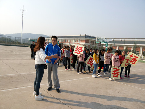 在观看了广播操的训练状况和听取了团总支、学生会的学生干部关于运动会入场式的筹备安排、创意方案等工作的汇报以后,何老师紧接着观看了方阵表演,40名远动健将们迈着整齐的步伐,满怀热情的喊着“青春飞扬,经贸最强”,队员们所组成的方阵整齐有序的变换着队形,渐渐形成一对代表梦想的翅膀。