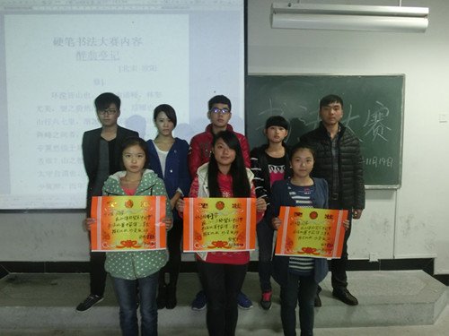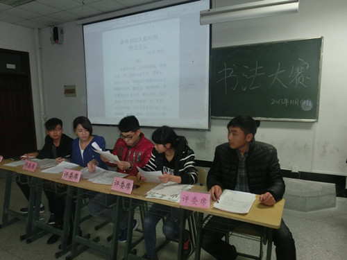 2013年11月14日晚,为了响应系部学风建设,弘扬中华民族的优秀传统文化,繁荣书法艺术,增强系部文化氛围,在经贸系党总支的部署下,经贸系团总支、学生会在1116教室成功举办第一届书法大赛。