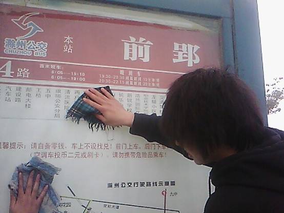 同学们仔细擦洗站台的每一个角落,经过一个上午的辛苦劳动,将活动中所计划清洁的公交站台全部清理的干干净净。
