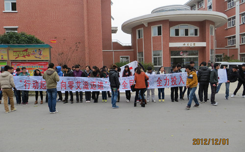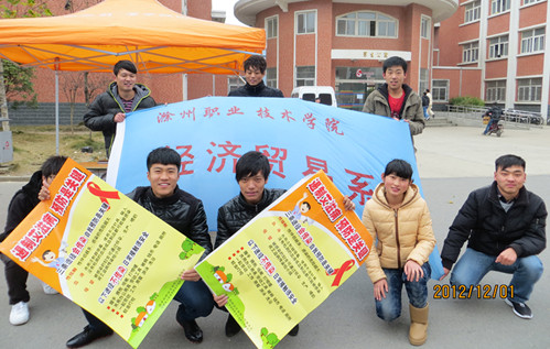 为更好地落实艾滋病防治措施,提高广大学生防艾意识。在12月1日第25个世界艾滋病日来临之际,经贸系团总支、学生会积极组织学生在校园宿舍前的主干道上向同学们介绍防艾知识。