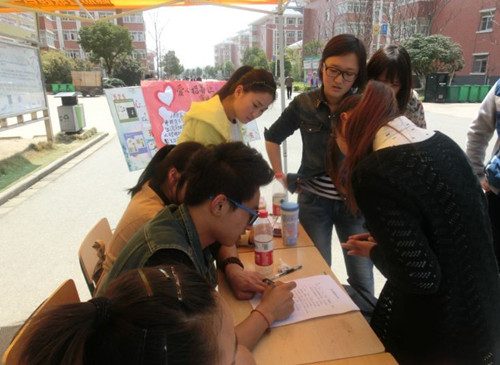 团学干们在女生宿舍一号楼下认真宣传爱心活动,吸引了同学们前来积极募捐。活动主要收集在校学生的衣物、书本、纸张、塑料瓶等废弃物品。