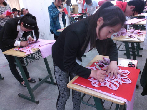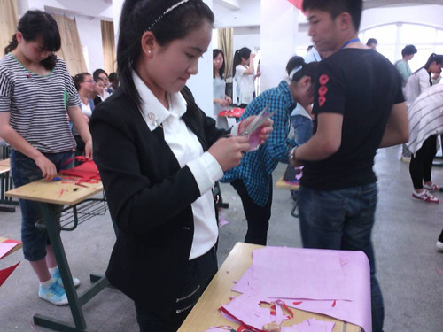 为了弘扬中国传统文化,丰富同学们的课余生活,锻炼同学们的动手能力,2014年5月14日中午,经济贸易系代表们积极参加了由传媒工程系开展的“心随手动”剪纸比赛,并在比赛中获得了团体第三名的好成绩。