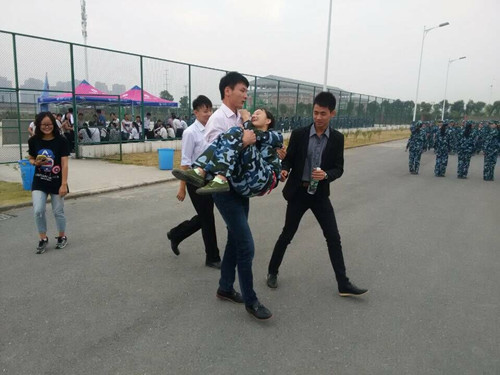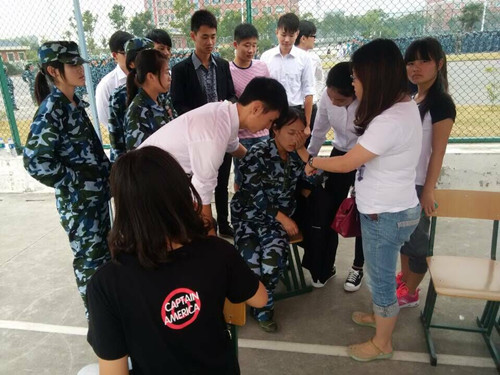 2015年9月19日上午,在经贸系军训场地发生一起因暴晒而中途晕倒事件。此时在军训服务点的的志愿者看到这一幕,飞快的跑到案发点,急忙抬起晕倒的女生进行基本救护。